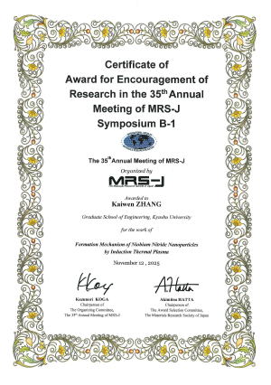 第35回日本MRS年次大会 優秀賞 (2025年12月) Formation Mechanism of Niobium Nitride Nanoparticles by Induction Thermal Plasma |